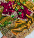 The matching designer blouse is adorned with heavy embroidery and delicate detailing on the sleeves and neckline, making it a perfect complement to the saree. Ideal for weddings, festive celebrations, and special occasions, this ensemble blends classic craftsmanship with contemporary elegance.
