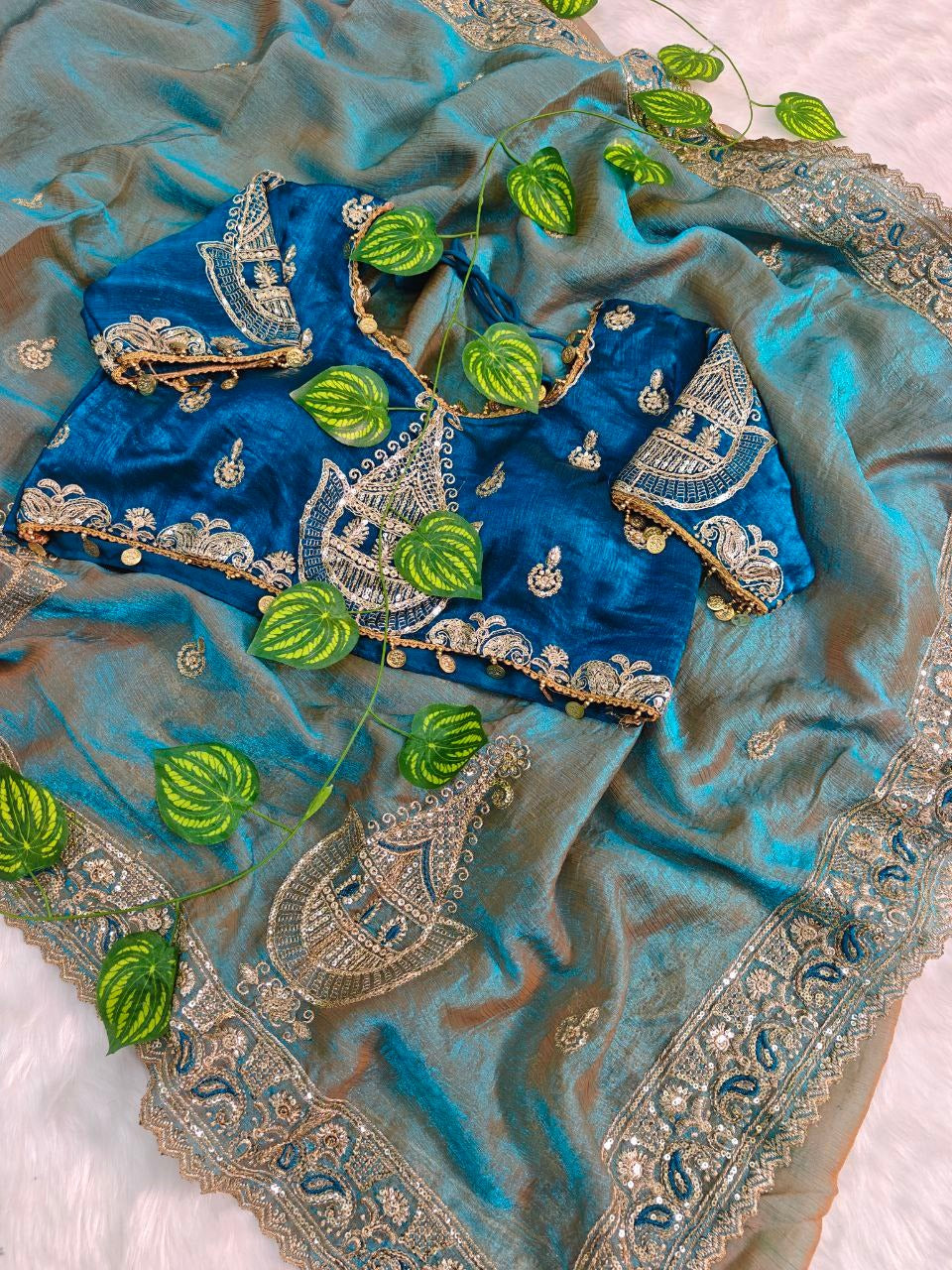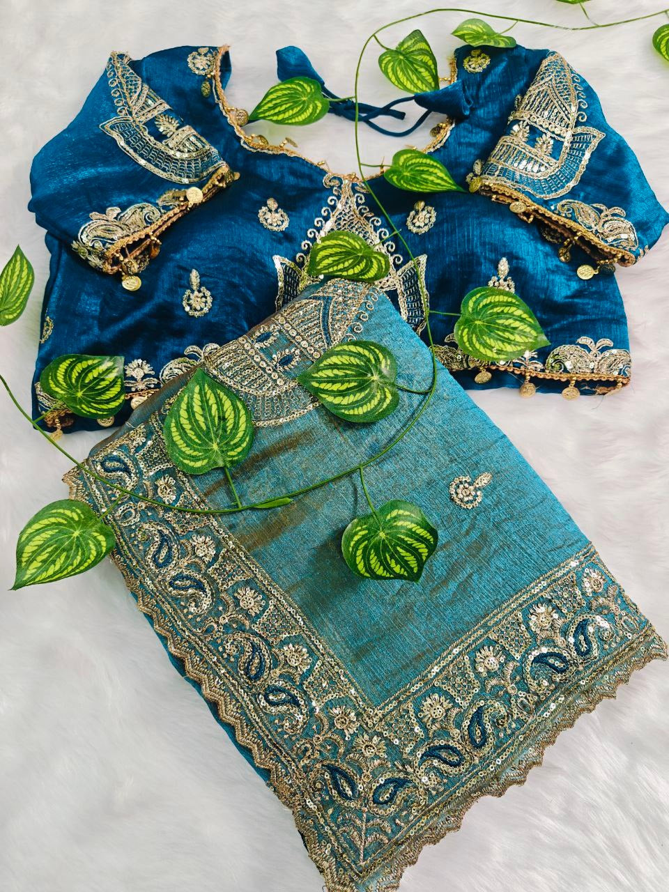 Grace your festive wardrobe with this teal blue embroidered silk saree, paired with a beautifully detailed designer blouse for a royal ethnic look.